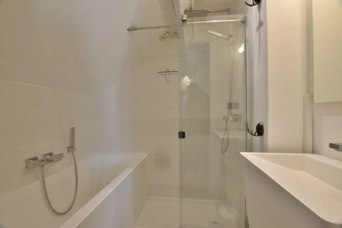 Un bain, une douche et un lavabo, dans le seul "petit coin" libre d' une suite parentale. Un défi relevé avec brio pour cette salle d'eau magnifique où chaque détail a été pensé.