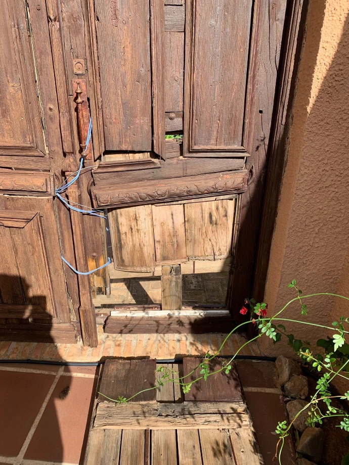 Travail minutieux de restauration d'une porte ancienne en bois, usée par le temps et cassée par le vent. Un vrai travail d' "artiste-ébéniste" pour une réalisation solide et splendide.